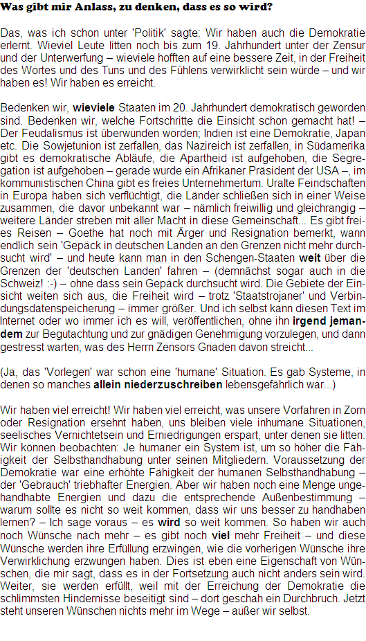 Bedenken wir, wieviele Staaten im 20. Jahrhundert demokratisch geworden sind. Bedenken wir, welche Fortschritte die Einsicht schon gemacht hat! - Der Feudalismus ist überwunden worden; Indien ist eine Demokratie, Japan etc. Die Sowjetunion ist zerfallen, das Nazireich ist zerfallen, in Südamerika gibt es demokratische Abläufe, die Apartheid ist aufgehoben, die Segre-gation ist aufgehoben - gerade wurde ein Afrikaner Präsident der USA -, im kommunistischen China gibt es freies Unternehmertum. Uralte Feindschaften in Europa haben sich verflüchtigt, die Länder schließen sich in einer Weise zusammen, die davor unbekannt war - nämlich freiwillig und gleichrangig - weitere Länder streben mit aller Macht in diese Gemeinschaft... Es gibt frei-es Reisen - Goethe hat noch mit Ärger und Resignation bemerkt, wann endlich sein 'Gepäck in deutschen Landen an den Grenzen nicht mehr durch-sucht wird' - und heute kann man in den Schengen-Staaten weit über die Grenzen der 'deutschen Landen' fahren - (demnächst sogar auch in die Schweiz! :-) - ohne dass sein Gepäck durchsucht wird. Die Gebiete der Ein-sicht weiten sich aus, die Freiheit wird - trotz 'Staatstrojaner' und Verbin-dungsdatenspeicherung - immer größer. Und ich selbst kann diesen Text im Internet oder wo immer ich es will, veröffentlichen, ohne ihn irgend jeman-dem zur Begutachtung und zur gnädigen Genehmigung vorzulegen, und dann gestresst warten, was des Herrn Zensors Gnaden davon streicht...
