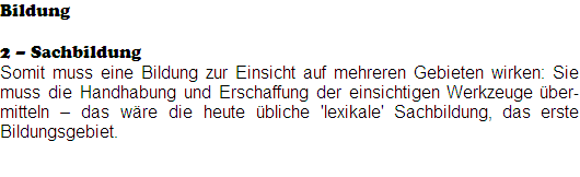 Somit muss eine Bildung zur Einsicht auf mehreren Gebieten wirken: Sie muss die Handhabung und Erschaffung der einsichtigen Werkzeuge übermitteln - das wäre die heute übliche 'lexikale' Sachbildung, das erste Bildungsgebiet.