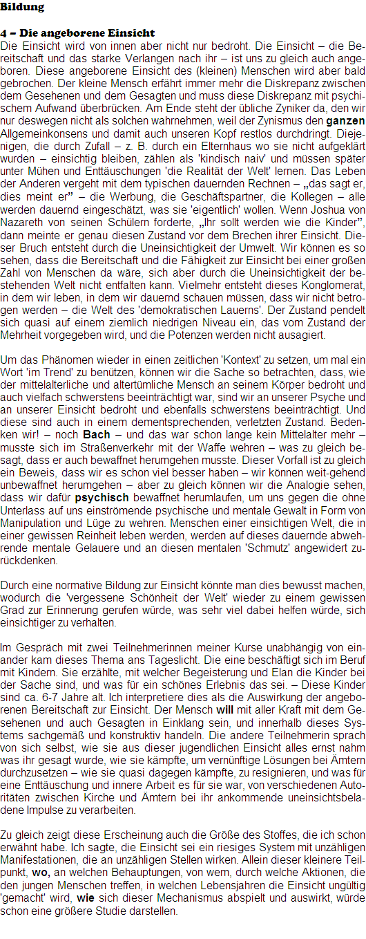 Im Gespräch mit zwei Teilnehmerinnen meiner Kurse unabhängig von ein-ander kam dieses Thema ans Tageslicht. Die eine beschäftigt sich im Beruf mit Kindern. Sie erzählte, mit welcher Begeisterung und Elan die Kinder bei der Sache sind, und was für ein schönes Erlebnis das sei. - Diese Kinder sind ca. 6-7 Jahre alt. Ich interpretiere dies als die Auswirkung der angebo-renen Bereitschaft zur Einsicht. Der Mensch will mit aller Kraft mit dem Ge-sehenen und auch Gesagten in Einklang sein, und innerhalb dieses Sys-tems sachgemäß und konstruktiv handeln. Die andere Teilnehmerin sprach von sich selbst, wie sie aus dieser jugendlichen Einsicht alles ernst nahm was ihr gesagt wurde, wie sie kämpfte, um vernünftige Lösungen bei Ämtern durchzusetzen - wie sie quasi dagegen kämpfte, zu resignieren, und was für eine Enttäuschung und innere Arbeit es für sie war, von verschiedenen Auto-ritäten zwischen Kirche und Ämtern bei ihr ankommende uneinsichtsbela-dene Impulse zu verarbeiten.