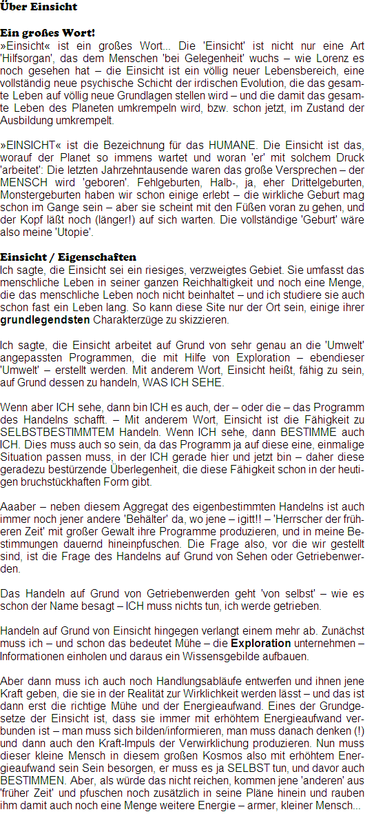 »EINSICHT« ist die Bezeichnung für das HUMANE. Die Einsicht ist das, worauf der Planet so immens wartet und woran 'er' mit solchem Druck 'arbeitet': Die letzten Jahrzehntausende waren das große Versprechen - der MENSCH wird 'geboren'. Fehlgeburten, Halb-, ja, eher Drittelgeburten, Monstergeburten haben wir schon einige erlebt - die wirkliche Geburt mag schon im Gange sein - aber sie scheint mit den Füßen voran zu gehen, und der Kopf läßt noch (länger!) auf sich warten. Die vollständige 'Geburt' wäre also meine 'Utopie'.