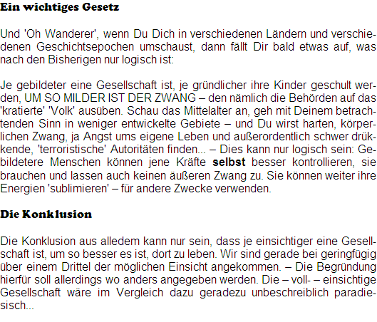 Je gebildeter eine Gesellschaft ist, je gründlicher ihre Kinder geschult wer-den, UM SO MILDER IST DER ZWANG - den nämlich die Behörden auf das 'kratierte' 'Volk' ausüben. Schau das Mittelalter an, geh mit Deinem betrach-tenden Sinn in weniger entwickelte Gebiete - und Du wirst harten, körper-lichen Zwang, ja Angst ums eigene Leben und außerordentlich schwer drük-kende, 'terroristische' Autoritäten finden... - Dies kann nur logisch sein: Ge-bildetere Menschen können jene Kräfte selbst besser kontrollieren, sie brauchen und lassen auch keine äußeren Zwang zu. Sie können weiter ihre Energien 'sublimieren' - für andere Zwecke verwenden.