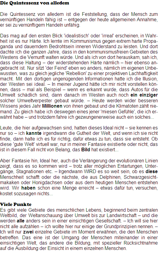Aber Fantasie hin, Ideal her, auch die Verlängerung der evolutionären Linien zeigt, dass es so kommen wird - trotz aller möglichen Entartungen, Untergänge, Stagnationen etc. - Irgendwann WIRD es so weit sein, ob es diese Menschheit schafft oder die nächste, die aus Delphinen, Schwarzgesichtmakaken oder Honigdachsen oder aus dem heutigen Menschen entstehen wird. Wir haben schon eine Menge erreicht - etwas dafür tun, versuchen, kostet sozusagen nichts...