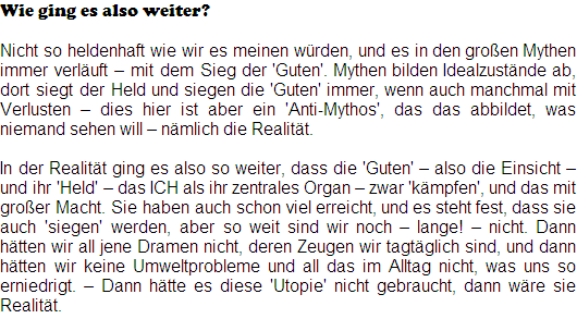 In der Realität ging es also so weiter, dass die 'Guten' - also die Einsicht - und ihr 'Held' - das ICH als ihr zentrales Organ - zwar 'kämpfen', und das mit großer Macht. Sie haben auch schon viel erreicht, und es steht fest, dass sie auch 'siegen' werden, aber so weit sind wir noch - lange! - nicht. Dann hätten wir all jene Dramen nicht, deren Zeugen wir tagtäglich sind, und dann hätten wir keine Umweltprobleme und all das im Alltag nicht, was uns so erniedrigt. - Dann hätte es diese 'Utopie' nicht gebraucht, dann wäre sie Realität.