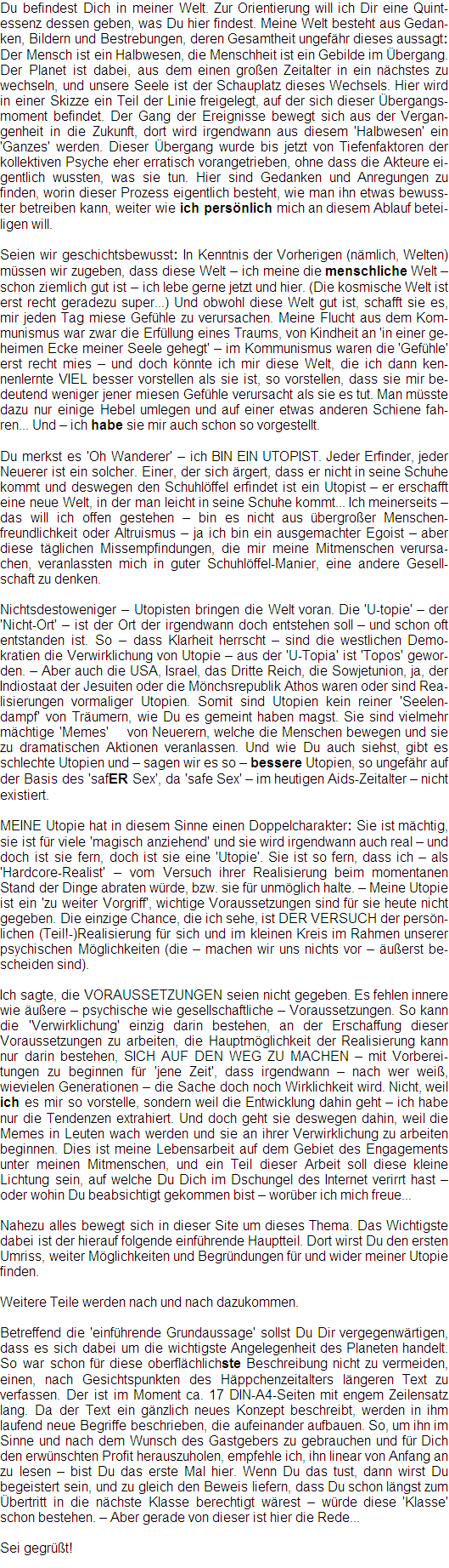 MEINE Utopie hat in diesem Sinne einen Doppelcharakter: Sie ist mächtig, sie ist für viele 'magisch anziehend' und sie wird irgendwann auch real - und doch ist sie fern, doch ist sie eine 'Utopie'. Sie ist so fern, dass ich - als 'Hardcore-Realist' - vom Versuch ihrer Realisierung beim momentanen Stand der Dinge abraten würde, bzw. sie für unmöglich halte. - Meine Utopie ist ein 'zu weiter Vorgriff', wichtige Voraussetzungen sind für sie heute nicht gegeben. Die einzige Chance, die ich sehe, ist DER VERSUCH der persön-lichen (Teil!-)Realisierung für sich und im kleinen Kreis im Rahmen unserer psychischen Möglichkeiten (die - machen wir uns nichts vor - äußerst be-scheiden sind).